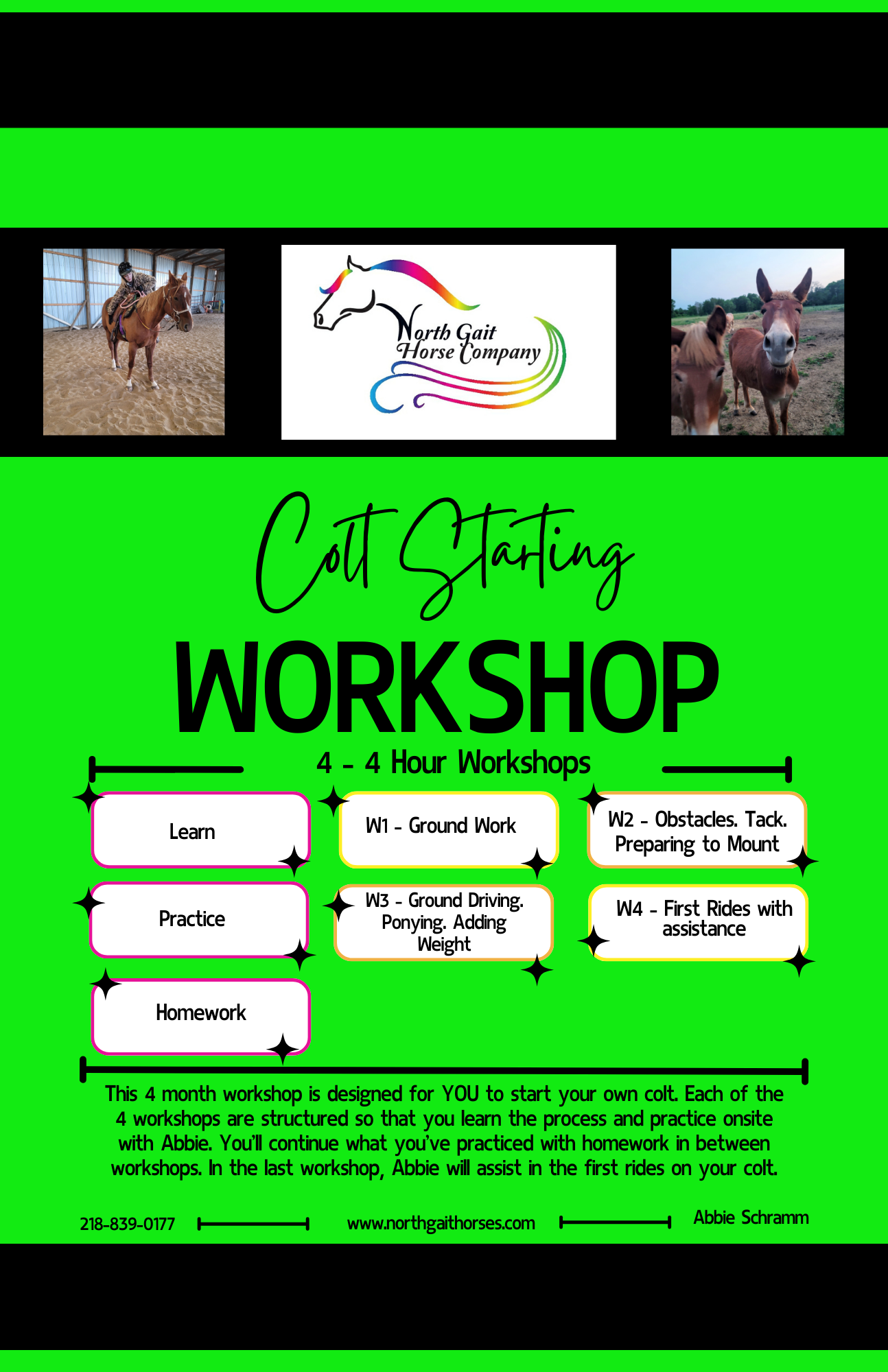Colt Starting Workshops - Registration Opens April 27 Lease Program - Open Year Round Training Project Program - Registration starts in September Intensive Horsemanship Series - 2024 - Registration Closed for 2024 - Watch for 2025 details! Equine Riding/Driving/Training Instruction Agreement, Liability Release, and Assumption of Risk Agreement for Individuals